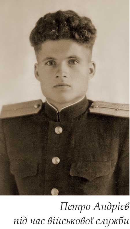 Водночас навчався у вечірній школі. З 1948 по 1953 рр. проходив військову службу. Спочатку — на відбудові шахт Донбасу. Потім служив у Центральній групі військ в Австрії, де пройшов школу військових автомеханіків та курси середніх командирів. Працював у м. Берндорф на заводі «Месершміт», який до війни випускав авіадвигуни, а після — став власністю Управління Радянського майна в Австрії. Подальшу службу проходив дільничним в порту Маріуполя, в Іркутську (РФ) на будівництві алюмінієвого заводу «Східтяжбуд». Працював землекопом, водієм лісовоза. З вересня 1953 р. — лейтенант запасу. Впродовж 1956–1960 рр. навчався в Ачинському індустріальному технікумі (Краснодарський край, РФ). Отримав призначення в Березовську трудову колонію для дітей-порушників закону на посаду головного механіка. Всі посади у закладі обіймали військові. Велика увага приділялась виховному процесу. За спогадами П.?А. Андрієва, за час його роботи у колективі не було якихось надзвичайних ситуацій. Туга за рідним краєм постійно переймала Петра Андрійовича. Дружина також хотіла, щоб їх ній син пішов до школи саме на землі дідів і прадідів. У 1962 р. родина переїхала у Полтаву, де мешкає постійно. Протягом 1962–1969 рр. П. А. Андрієв працював на заводі «Знамено» майстром, начальником ділянки, механіком транспортного цеху. З 1969 по 1990 рр. — головний механік полтавського спецуправління № 405 «Південелектромонтаж». Брав участь у будівництві заводів «Хіммаш», «Продмаш», реконструкції турбоцеху заводу «Електромотор». У 1974 р. бригада монтажників, у складі якої був Петро Андрієв, змонтувала прожекторні щогли на стадіоні «Ворскла» (колишній «Колос»). «Жодне спецуправління в Полтаві не взялося за складний монтаж, а наші досвідчені монтажники зібрали стальні конструкції на вищому рівні», — згадує він. Серед інших об’єктів, куди був направлений у відрядження, — м’ясокомбінати в Миргороді та Лубнах, молокозаводи в Полтаві, Хоролі, Лубнах, арматурний завод в Миргороді. Прокладав лінії кабельних мереж і тролейбусних ліній; працював на будівництві житла, соціальних та культурних закладів. Протягом 1990–1996 рр. — майстер-електромонтажник Полтавського експериментального ливарно-механічного заводу. Загальний виробничий стаж становить 55 років, в трудовій книжці понад 20 записів заохочень, премій, нагород, подяк. Характерно, що влітку під час відпустки не знав відпочинку, постійно з 1964 по 1977 рр. працював комбайнером, у власному здобутку 10 тис. тонн намолоченого зерна. З 1996 р. є членом Народного Руху України. У січні 2000 р. обраний головою Полтавського обласного відділення Всеукраїнського об’єднання ветеранів, очолював раду до 2005 р. Потім обраний почесним головою ради об’єднання. У 2004 р. на Великій Раді в Києві зі створення Соборного козацтва України «Січ» обраний до ради старійшин СКУ «Січ», згодом — головою Полтавської крайової ради старійшин. З 2005 р. продовжує роботу зі створення у районах області первинних осередків Спілки освітян України та осередків СКУ «Січ»: Гребінка, Пирятин, Чорнухи, Лохвиця, Гадяч, Зіньків, Диканька, Карлівка. Мета діяльності об’єднання — консолідація українського суспільства, відродження історичної правди, відновлення та збереження культурної спадщини, залучення козацьких організацій до охорони культурної спадщини, фізкультурно-спортивної роботи та військово-патр