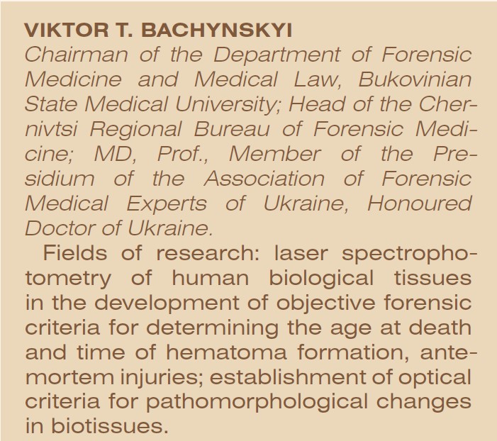Завдяки зусиллям медика, освітянина, керівника й науковця Бачинського Віктора Теодосовича розроблено новий напрям у судовій медицині — експертна діагностика змін біологічних тканин та середовищ людини за морфологічними та лабораторними показниками у вирішенні актуальних питань судово-медичної науки та практики. До сфери наукових зацікавлень ученого також входять питання лазерної спектрофотометрії біологічних тканин людини в розробці об’єктивних судово-медичних критеріїв визначення давності настання смерті й часу утворення гематом, зажиттєвості тілесних ушкоджень та встановлення оптичних критеріїв патоморфологічних змін біотканин.
