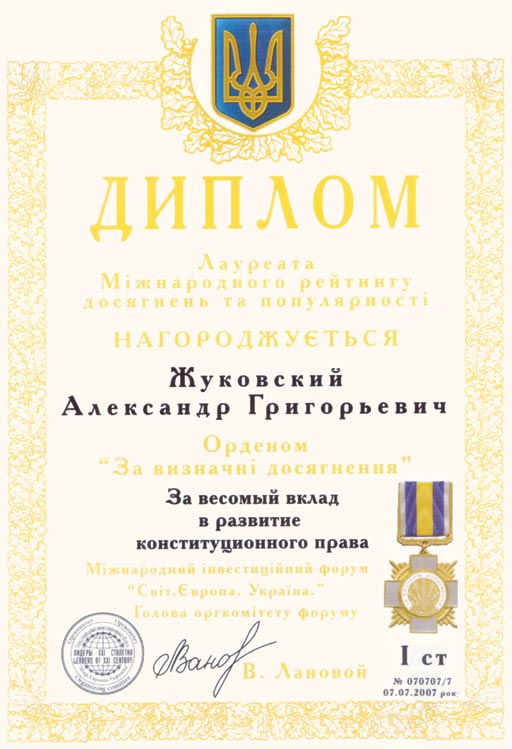Рішенням оргкомітету Міжнародного інвестиційного форуму ''Світ. Європа. Україна'' від 7 липня 2007 р. О. Г. Жуковського визнано лауреатом Міжнародного рейтингу досягнень і популярності та нагороджено орденом ''За визначні досягнення'' І ступеня.