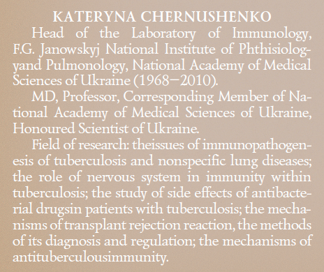 У медицину приходять і залишаються назавжди з величезним бажанням допомагати людям. Яскравий приклад – Катерина Федорівна Чернушенко. Народилася 3 грудня 1926 р. у м. Конецгір’я Архангельської області. Омріяну медичну освіту здобувала на лікарському факультеті Архангельського медичного інституту, після закінчення якого у 1950 р. переїхала до Києва. Відтоді її лікувальна і наукова діяльність була пов’язана з Київським інститутом фтизіатрії (нині – Національний інститут фтизіатрії і пульмонології імені Ф.Г. Яновського). Перші наукові пошуки стосувалися ролі нервової системи в імунітеті при туберкульозі.