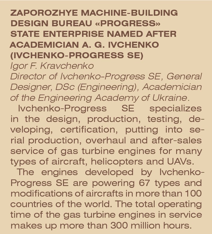 Державне підприємство «Запорізьке машинобудівне конструкторське бюро «Прогрес» імені академіка О. Г. Івченка (ДП «Івченко-Прогрес») вирішує проблеми сучасного розвитку таких галузей промислового комплексу України, як авіаційна, паливно-енергетична та машинобудівна. Уже протягом 75 років у співпраці з провідними підприємствами та науковими установами бюро створює високотехнологічну авіаційну та індустріальну техніку, визнану в Україні та світі.