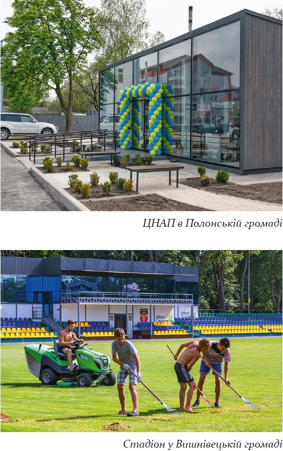 Проте, просто цифри фінансів мало про що говорять. Більш красномовними є результати громад, досягнені ними завдяки зростанню надходжень до місцевих бюджетів. На місцях закипіли будівельні роботи. За роки реформи відновлено та побудовано тисячі об’єктів соціальної інфраструктури: школи, дитячі садочки, інклюзивні центри, амбулаторії, фельдшерсько-акушерські пункти, заклади культури, дитячі та спортивні майданчики, скейтпарки, футбольні поля і цілі спортивні комплекси. Громади почали відновлювати місцеві дороги, запускати маршрути громадського транспорту, закуповувати шкільні автобуси, комунальний та спеціалізований медичний транспорт та транспорт для людей з інвалідністю; відкривати поліцейські станції і центри безпеки. Якісні перетворення почалися і в сферах благоустрою, поводження з твердими побутовими відходами, водозабезпечення та водовідведення: громади отримали можливість зробити свої вулиці освітленими в темну пору доби і безпечними, оснастити їх цілодобовим відеоспостереженням, оновити мережі, покращити їх обслуговування, впроваджувати централізований збір сміття. Іншими словами, громади вперше за всі роки незалежності отримали можливості вирішити проблеми, які накопичувалися роками.