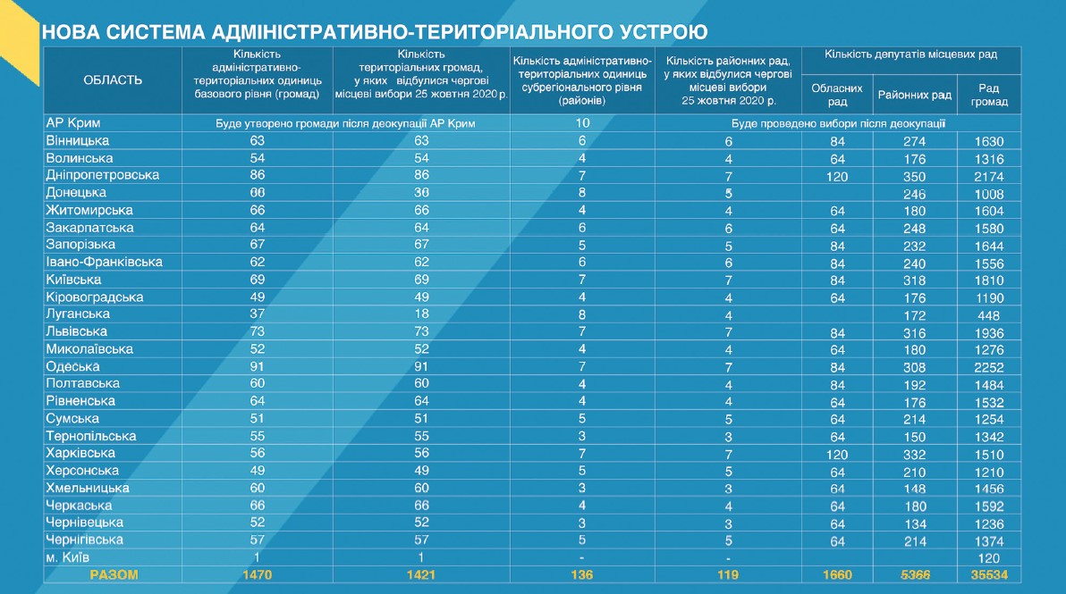 Завдання ж реформи — запровадити повсюдність ефективного місцевого самоврядування, скрізь створити однаково сприятливі умови для розвитку. З огляду на те, що, відповідно до Конституції України, в 2020 р. мали відбутися чергові місцеві вибори, а також те, що реформа не може тривати безкінечно, держава завершила процес формування громад, визначивши урядовими рішеннями їх центри, затвердивши їх території. Цим рішенням передували сотні консультацій з представниками громад, областей, асоціацій органів місцевого самоврядування, народними депутатами, експертами. Таким чином було завершено формування нового адміністративно-територіального устрою базового рівня. На карті України з’явилося 1470 територіальних громад: 410 міських, 433 селищних та 627 сільських.