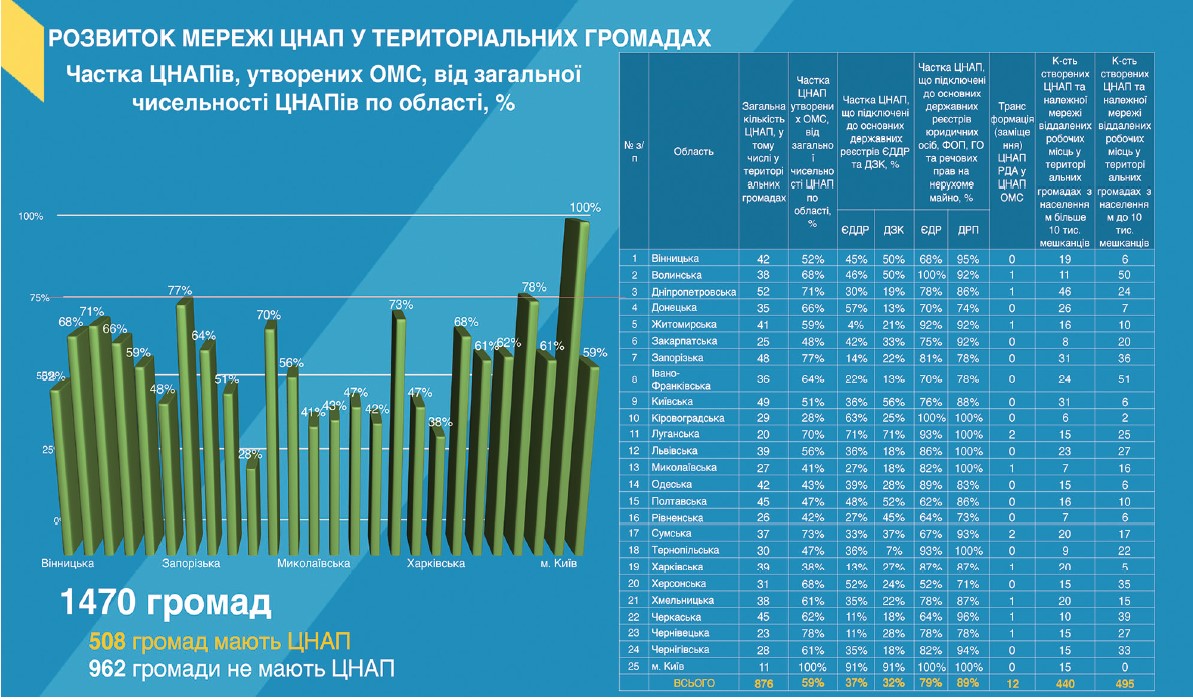Значну допомогу громадам у створенні центрів надання адміністративних послуг надають держава і міжнародні програми технічної допомоги. В громадах вже діє більше п’яти сотень ЦНАП, кожен з яких, в залежності від можливостей і потреб, надає від кількох десятків до кількох сотень адміністративних послуг. Реформа ставить завдання створити такі центри в кожній територіальній громаді.
