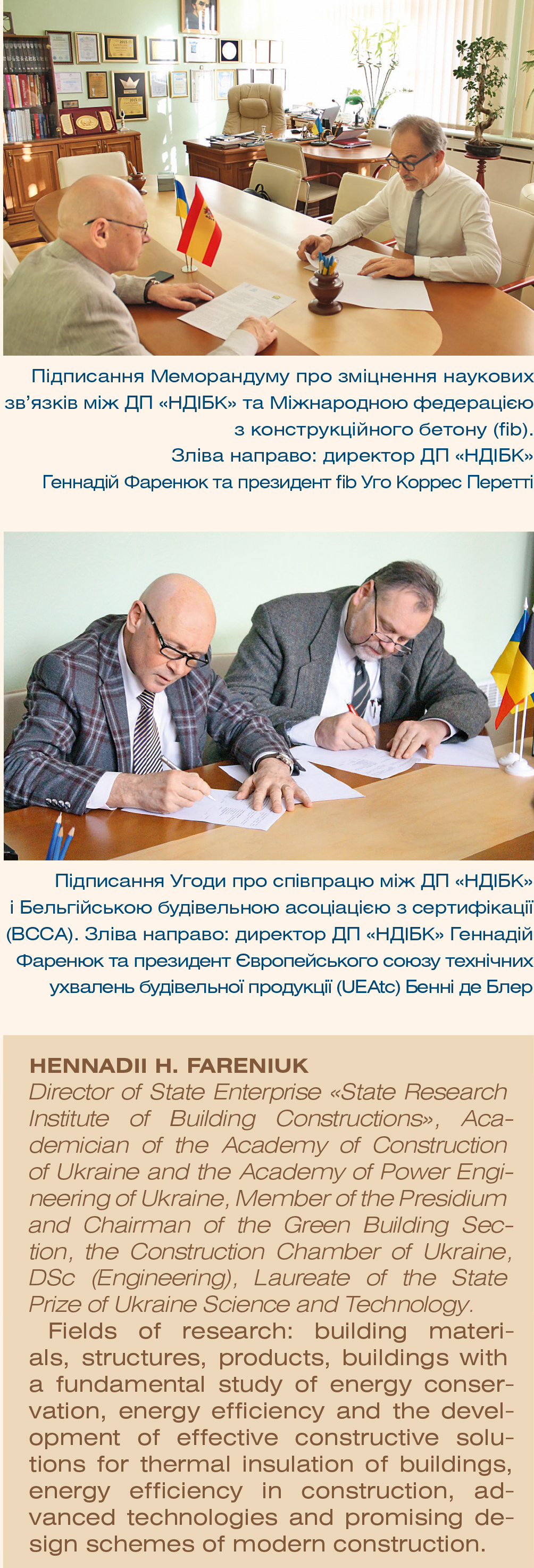 У 2012 р. Геннадій Фаренюк призначений директором Державного підприємства «Державний науково-дослідний інститут будівельних конструкцій» (ДП «НДІБК») — найбільшого та найпотужнішого науково-дослідного, проєктно-конструкторського та випробувально-експериментального центру будівельної галузі України. ДП «НДІБК» є науково-технічною установою, що за своїм потенціалом має стратегічне значення для економіки й безпеки держави відповідно до Постанови Кабінету Міністрів України від 4 березня 2015 р. № 83 «Про затвердження переліку об’єктів державної власності, що мають стратегічне значення для економіки і безпеки держави». Відповідно до наказу Міністерства освіти та науки України від 1 квітня 2019 р. №?422 ДП «НДІБК» вкотре внесено до Державного реєстру наукових установ, які отримують підтримку держави. Інститут є базовою організацією з науково-технічної діяльності в будівництві з питань формування національної нормативної бази, інтегрованої в міжнародний нормативно-правовий простір технічного регулювання в будівництві, підвищення надійності та безпеки будівель і споруд, забезпечення енергозбереження й підвищення енергоефективності будівель і споруд, перетворення об’єкта «Укриття» Чорнобильської АЕС на екологічно безпечну систему, проєктування та будівництва