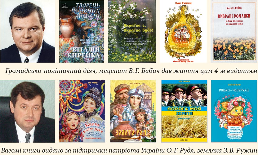 Завдяки меценатам, а це: В. Бабич, О. Рудь, О. Поліщук, С. Тігіпко, Г. Кірпа, В. Петрович, Н. Рубан, В. Левченко, А. Потопальський та ще багато небайдужих українців, вдається реалізувати творчі задуми письменниці. Видатні художники сучасності: Олександр Охапкін, Тамара та Олеся Вакуленки професійно проілюстували декілька книжкових видань.