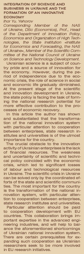 Українська наука протягом декількох десятиріч була предметом гордості країни та джерелом інновацій для економіки. Однак у період незалежності, внаслідок економічної кризи, роль науки у суспільно-економічному житті поступово зменшувалася. Проблеми наукового сектору в Україні загострювалися протягом багатьох років і в даний час досягли таких масштабів, що ні швидкі, ні «прості» рішення неспроможні їх вирішити. Завдання державної політики в галузі науки і техніки полягає в тому, щоб сформувати національний дослідницький потенціал, який ще залишається, таким чином, щоб він більш ефективно сприяв процесам економічного відновлення. Зробити це буде нелегко, адже цілі наукові напрями практично зникли, як і підприємства і навіть сектори промисловості, які використовували наукові результати. Як приклад можна навести вітчизняну електроніку, чисельність зайнятих у якій скоротилася за останні 30 років приблизно у 20 разів, а ті працівники на виробничих підприємствах, що залишилися, займаються ремонтом існуючої техніки або монтажем продукції із імпортних комплектуючих. Тому абсолютно природнім виявляється той факт, що найбільш активна співпраця між наукою та бізнесом в останні десятиріччя спостерігалася саме у тих секторах, які стали провідними в українській економіці — металургії, енергетиці, важкому машинобудуванні, сільському господарстві. Великі компанії, у яких були значні фінансові ресурси, частіше ставали замовниками результатів досліджень і розробок, ніж середні та малі підприємства. У найбільш скрутному становищі опинилися науково-дослідні інститути (НДІ) так званого галузевого сектору науки. Більша частина з них припинила своє існування в якості наукових організацій. У деяких випадках розпад старої галузевої структури економіки радянського типу привів до розвитку нових зв’язків між науково-дослідними інститутами та промисловими фірмами й особливо до розвитку прямих зв’язків з іноземними компаніями. Фінансування наукових досліджень і розробок в окремі роки сягала 25?% від загальних витрат за цією статтею. Водночас зміна кордонів між приватним і державним секторами призвела до появи нових, специфічних для країни схем впровадження інновацій, зокрема за рахунок створення малих та середніх наукових підприємств (МСП) на базі того, що залишилося від галузевих установ. На відміну від галузевих інститутів і конструкторських бюро, науково-дослідні інститути академій наук України спираються на державний бюджет як основне джерело їх фінансування. Вони отримують приблизно три чверті своїх коштів безпосередньо від держави. Такий рівень та структура фінансування не гарантують ефективного розвитку, але забезпечують основу для виживання науково-дослідних інститутів. В останні роки кількість співробітників в академіях наук стабілізувалася, а кількість науково-дослідних інститутів подвоїлася. Частка академій наук в загальному обсязі фінансування ДіР і частка у загальній чисельності зайнятих у науково-дослідному секторі за останні роки зросли.