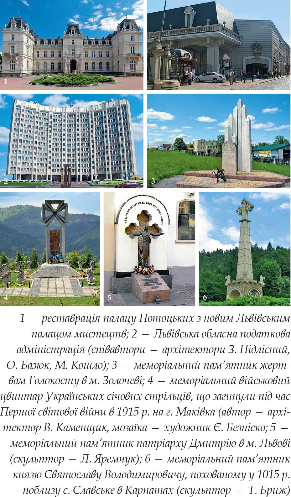В. Стефанику в Івано-Франківську (1994); пам’ятники жертвам політичних репресій у Львові (1998) та Дрогобичі (2000); пам’ятники С. Бандері у Трускавці (2010), Старому Самборі (2009), Стрию (1991); Український військовий меморіал 1915 р. в Карпатах (1997); меморіал Марсове поле у Львові (1970); пам’ятник князю Святославу Володимировичу (1996–2008) та інші. Автор понад 30 меморіальних таблиць, зокрема Л. Українці у Відні (2000).
