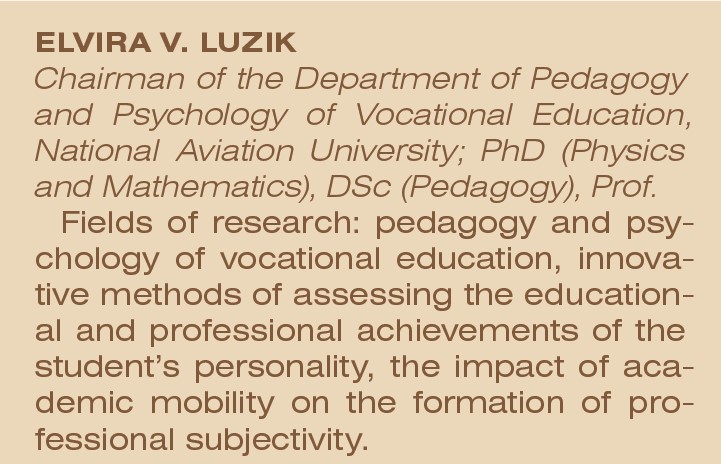 Професорка Лузік Ельвіра Василівна має унікальні міждисциплінарні знання у галузі вищої математики й механіки та сфери педагогіки й психології професійної освіти. До напрямів її наукових інтересів входять інноваційні методи оцінювання навчальних та професійних досягнень особистості студента, вплив академічної мобільності на формування професійної суб’єктності, наукове конструювання та математичне обґрунтування ефективності та адаптивності освітньо-інформаційного простору закладу вищої технічної освіти, вплив толерантності до невизначеності на формування особистісного та професійного розвитку майбутнього фахівця авіаційного профілю.