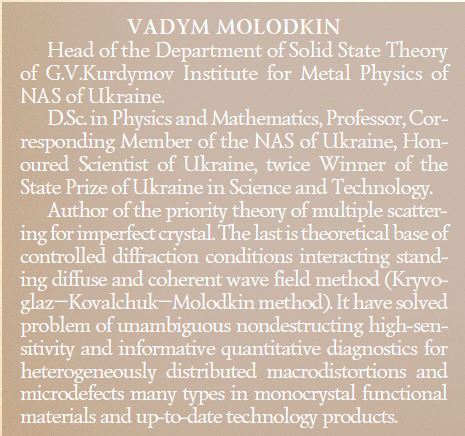 Вадим Борисович Молодкін – видатний учений, відомий своїми працями з фізики взаємодії випромінення з речовиною. Побудував квантово-механічну статистичну теорію багатократного розсіяння випромінення у кристалах з дефектами, яка має світовий пріоритет.