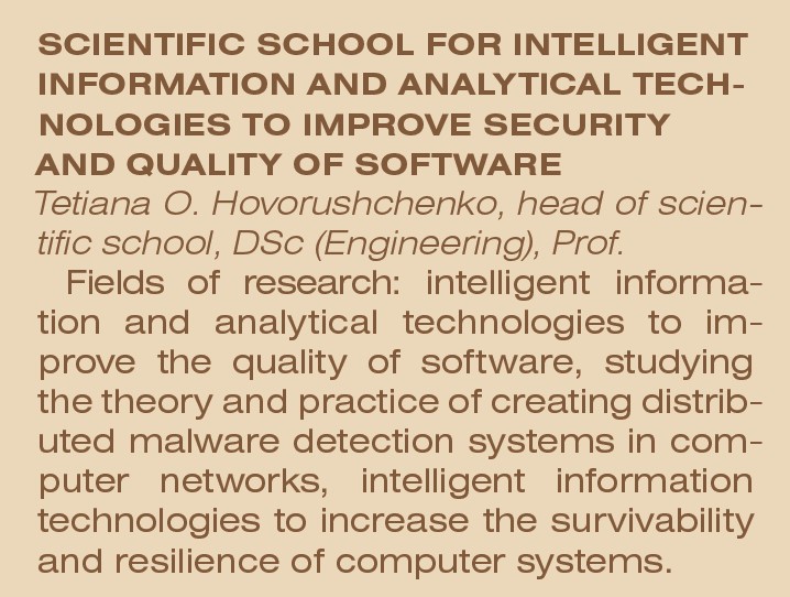 У колективі наукової школи працюють більш ніж 25 кандидатів наук і докторів філософії та 3 доктори наук — професори Т. О. Говорущенко, О. С. Савенко і С. М. Лисенко, які очолюють основні напрями досліджень. Сфера наукових інтересів Тетяни Олександрівни Говорущенко — інтелектуальні інформаційно-аналітичні технології підвищення якості програмного забезпечення. Під керівництвом Олега Станіславовича Савенка відбувається вивчення теорії та практики створення розподілених систем виявлення зловмисного програмного забезпечення в комп’ютерних мережах. Сергій Миколайович Лисенко зосередив увагу на темі інтелектуальних інформаційних технологій підвищення живучості та резильєнтності комп’ютерних систем. Дослідники наукової школи опублікували більш ніж 50 праць, індексованих