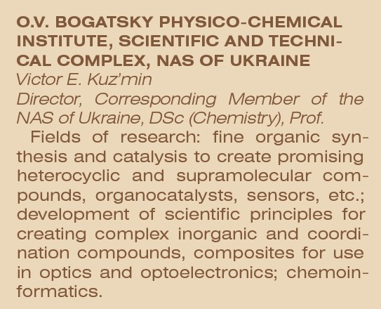 Науково-технічний комплекс «Фізико-хімічний інститут (ФХІ) ім. О. В. Богатського НАН України» — провідний центр медичної хімії та інновацій зі створення нових лікарських засобів — нейротропних, імунотропних, противірусних та антиагрегаційних препаратів. До напрямів діяльності інституту входять: тонкий органічний синтез і каталіз для створення перспективних гетероциклічних та супрамолекулярних сполук, органокаталізаторів та сенсорів тощо; розробка наукових принципів створення складних неорганічних і координаційних сполук, композитів для застосування в оптиці і оптоелектроніці; хемоінформатика (вирішення завдань «структура — властивості» для цілеспрямованого створення нових ліків, біорегуляторів, каталізаторів, реагентів, нанокомпозитів та інших речовин з комплексом необхідних властивостей). Розробки колективу наукової установи широко впроваджені в фармацевтичній промисловості та добре зарекомендували себе на вітчизняному фармацевтичному ринку.