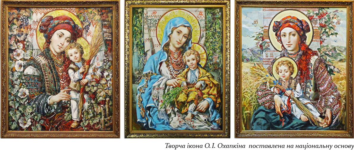 Дружина та донька Олександра є жіночим ідеалом, що мимоволі входить до творінь О. І. Охапкіна. Кожна картина-ікона — гра світла, рельєфно накладені шари фарби й контрасти. Найчастіше майстер зображає Богоматір із немовлям, Ісуса Христа, Святого Миколая, Святого Пантелеймона та сцени Благовіщення.