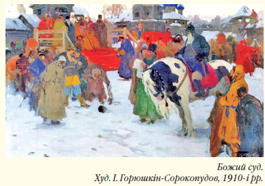 Цікавими були докази, які були одержані в процесі так званих «судів божих». До таких відносили судову клятву (рота), ордалії (випробування водою, залізом, вогнем) і судовий поєдинок (кулачний бій, боротьба, поєдинок на коні зі зброєю). Звідси пішли відомі нам поговірки — «пройшов вогонь і воду», «вивести на чисту воду» тощо. Судове рішення виконувалося негайно. Стороні, яка виграла справу, допомагали судові агенти князя, родичі. Змагально-обвинувальний процес міг бути припинений на будь-якій його стадії за примиренням сторін.