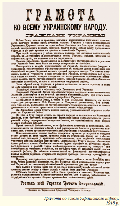 Того ж дня на з’їзді земельних власників в Україні був вчинений державний переворот. При підтримці німецького командування генерала П. Скоропадського було проголошено гетьманом України. Він відразу видав «Грамоту до всього українського народу». Українська Народна Республіка як назва національної держави була замінена назвою — «Українська держава».