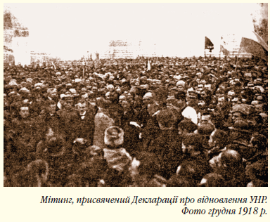 Гетьман П. Скоропадський не користувався підтримкою народних мас. Скориставшись зміною політичних обставин у зв’язку з революцією в Німеччині та Австро-Угорщині, опозиційний Український Національний Союз (УНС) 13 листопада 1918 р. створив Директорію на чолі з В. Винниченком, яка практично змусила П. Скоропадського зректися влади, а тому влада 14 грудня перейшла до Директорії. 19 грудня 1918 р. влада знову урочисто повернулася до Києва, де була відновлена Українська Народна Республіка.