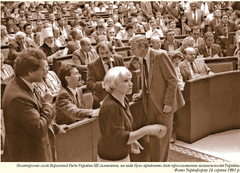 Виражаючи волю народу, Верховна Рада республіки 24 серпня 1991 p., прийняла «Акт проголошення незалежності України». В ньому, зокрема, вказано: «... — продовжуючи тисячолітню традицію державотворення в Україні, — виходячи з права на самовизначення, передбаченого Статутом ООН та іншими міжнародними документами, — реалізуючи “Декларацію про державний суверенітет України”, Верховна Рада проголосила незалежність України та створення самостійної української держави — Україна, територія є неподільною і недоторканою. Віднині. — заключав Акт, — на території України мають чинність виключно Конституція і закони України».