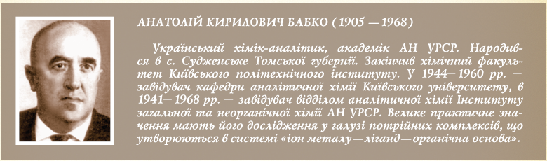 Відома наукова школа з аналітичної хімії започаткована академіком АН УРСР А.К. Бабком у Київському університеті та Інституті загальної та неорганічної хімії АН УРСР. А.К. Бабко вперше в Україні розпочав систематичні фізико-хімічні дослідження у розчинах, розвинув теорію та практику їх застосування в фотометричному аналізі, теоретично обґрунтував метод Остромисленського-Жоба (1935), який широко застосував на практиці для визначення складу та міцності комплексних сполук металів. Чимало праць А.К. Бабка присвячено застосуванню органічних сполук в аналітичній хімії, вибору оптимальних умов для фотометричного визначення різних іонів. Наукові інтереси А.К. Бабка широкі та багатогранні, він автор понад 450 робіт.