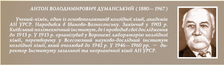 У 1968 р. було створено Інститут колоїдної хімії та хімії води ім. А.В. Думанського НАН України, який здійснює наукові дослідження з актуальних напрямків сучасної колоїдно-хімічної науки та проблем охорони навколишнього середовища.