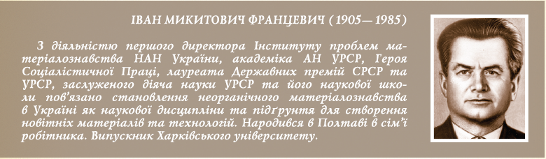 З діяльністю фізико-хіміка та матеріалознавця, організатора науки і першого директора Інституту проблем матеріалознавства НАН України, академіка НАН України, Героя Соціалістичної праці Івана Микитовича Францевича та його наукової школи пов’язано становлення неорганічного матеріалознавства в Україні як наукової дисципліни та підґрунтя для створення новітніх матеріалів та технологій. Цю лабораторію було 1955 р. реорганізовано в Інститут металокераміки та спеціальних сплавів АН УРСР, директором якого він став.