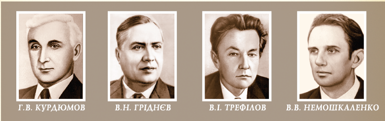 Формування й розвиток київської школи фізики металів та металознавства тісно пов’язано з іменами академіка АН СРСР та УРСР Г.В. Курдюмова та АН УРСР В.Н. Гріднєва, В.І. Трефілова та В.В. Немошкаленка, із створенням у Києві Лабораторії, а згодом Інституту металофізики АН України, в яких школа одержала бурхливого розвитку.