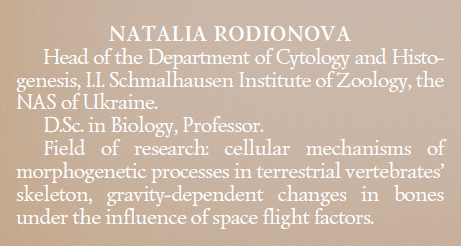 Спільно зі співробітниками відділу Н.В. Родіонова брала участь у національних науково-технічних програмах НАН України з вивчення впливу наслідків Чорнобильської катастрофи на живі організми. Встановлено, що тривале надходження та накопичення в кістковому скелеті радіоактивного стронцію і цезію призводить до розвитку остеодистрофічних процесів і прогресуванню вікового остеопорозу. В рамках міжнародного співробітництва з ученими Росії, США (НАСА), ЄС (ЕКА) в експериментах на тваринах на біосупутниках серії Bion, американській космічній лабораторії SLS-2, а також в наземних експериментах Наталією Василівною одержані унікальні для науки і практики дані про гравічутливість стромальних клітин кісткового мозку і клітин кісткової тканини, цитологічні механізми гравітаційно-залежних адаптивних і деструктивних перебудов у кістковому скелеті в умовах мікрогравітації. Також у рамках національних програм з космічних досліджень України Н.В. Родіонова з колегами виконує проект «Област», що передбачає постановку експерименту на російському модулі Міжнародної космічної станції. У 2013 р. проведений (спільно з російськими спеціалістами) міжнародний космічний експеримент на мишах (біосупутник «Біон-М1»).