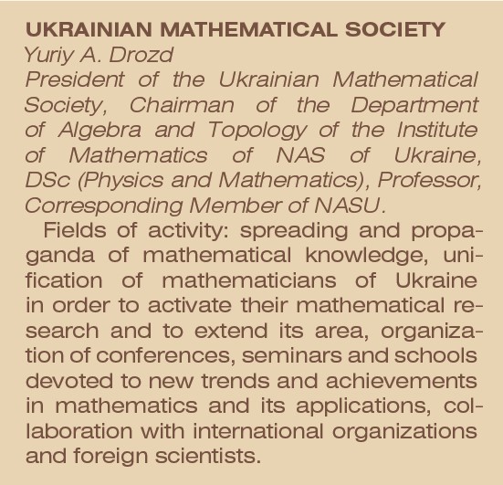 Українське математичне товариство створене в 1996 р. Його першим президентом був відомий український учений, академік І. В. Скрипник. Після нього президентом УМТ був член-кореспондент НАН України М. Л. Горбачук. У 2017 р. президентом УМТ обрано члена-кореспондента НАН України Ю. А. Дрозда. Згідно зі статутом метою Українського математичного товариства є задоволення та захист творчих інтересів математиків, сприяння створенню умов для їхньої роботи, розвитку математичної науки та освіти й впровадженню наукових розробок у практику. Задля цього УМТ бере участь в організації конференцій, семінарів, шкіл для молодих учених, які проводять, як правило, на міжнародному рівні, за участі науковців багатьох країн. УМТ входить до Міжнародного математичного союзу та Європейського математичного товариства, що дає його членам право отримувати ґранти цих міжнародних об’єднань, зокрема, для участі в міжнародних та європейських математичних конгресах, а українським університетам і науковим закладам — на підтримку наукових конференцій, семінарів та шкіл. Перспективи свого розвитку Українське математичне товариство бачить в активізації математичних досліджень в Україні, широкому залученні до них студентів і молодих учених. Маючи це за орієнтир, члени УМТ беруть активну участь у пропаганді й поширенні математичних знань серед учнівської та студентської молоді, читають лекції, на яких знайомлять слухачів із сучасними напрямами та досягненнями математики, організують учнівські й студентські гуртки та семінари, керують роботами в межах Малої академії наук.