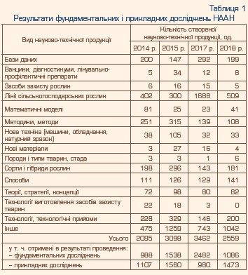 У сфері наукового забезпечення розвитку агропромислового виробництва провідну роль відіграє Національна академія аграрних наук України. У результаті проведених досліджень наукові працівники мережі НААН протягом 2014–2018 рр. щороку створювали понад 2 тис. видів науково-технічної продукції, із якої найбільша частка належить лінії сільськогосподарських рослин, новим сортам і гібридам, технологіям, технологічним прийомам і способам агропромислового виробництва, новітнім методикам й методам досліджень, методичним рекомендаціям тощо (табл. 1).