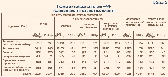 Серед створеної науково-технічної продукції установами НААН в 2011–2018 рр. понад 90 % становили наукові розробки, що мають науково-практичне значення. Близько 74,3 % створених у 2018 р. наукових розробок призначалися для використання у рослинництві, 11,9 % — у тваринництві, 8,4 % — для економічного супроводу агропромислового виробництва, 5,4 % — для цілей інноваційного провайдингу (табл. 2).
