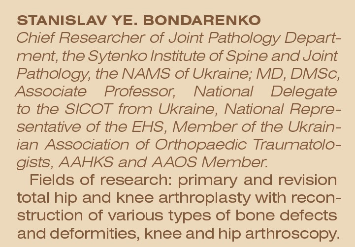 Хірургічна спеціалізація та напрями наукових досліджень доктора С. Є. Бондаренка — складне первинне і ревізійне ендопротезування кульшового та колінного суглобів, артроскопія колінного та кульшового суглобів, реконструктивно-відновлювальні операції на колінному та кульшовому суглобах. Стажувався у провідних клініках та на курсах кращих ортопедичних центрів світу (Австрія, Німеччина, США, Канада, Тайвань, Словаччина).