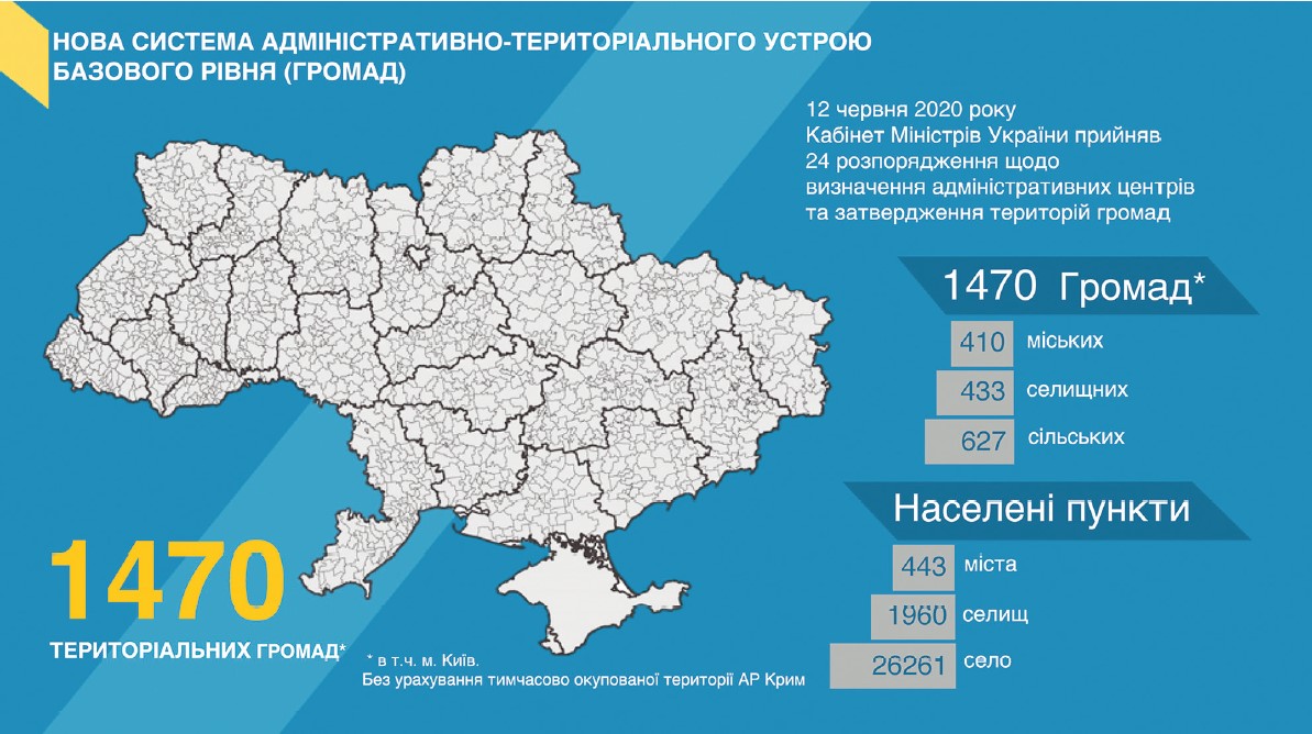 Завдання ж реформи — запровадити повсюдність ефективного місцевого самоврядування, скрізь створити однаково сприятливі умови для розвитку. З огляду на те, що, відповідно до Конституції України, в 2020 р. мали відбутися чергові місцеві вибори, а також те, що реформа не може тривати безкінечно, держава завершила процес формування громад, визначивши урядовими рішеннями їх центри, затвердивши їх території. Цим рішенням передували сотні консультацій з представниками громад, областей, асоціацій органів місцевого самоврядування, народними депутатами, експертами. Таким чином було завершено формування нового адміністративно-територіального устрою базового рівня. На карті України з’явилося 1470 територіальних громад: 410 міських, 433 селищних та 627 сільських.