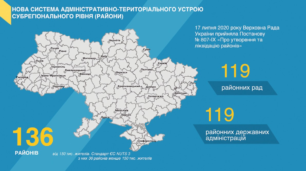 Попри очевидність необхідності змін, питання формування нових, ефективних районів було не менш складним і дискусійним в суспільстві, ніж об’єднання громад. Потрібно було знайти компроміс між усіма учасниками реформи. Тим більше, пік цих дискусій припав саме на період жорсткого карантину, який ввели в країні через пандемію коронавірусу. Зустрічі, перемовини, експертні обговорення відбувалися онлайн і це ускладнювало роботу. Зрештою все склалося. Невдовзі, слідом за урядовими рішеннями щодо визначення центрів громад та затвердження їх територій, наступний крок зробила Верховна Рада України — ліквідувала 490 старих районів та натомість створила 136 нових.
