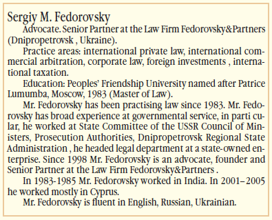 Адвокатська контора «Федоровський і партнери» зареєстрована Міністерством юстиції України 15 жовтня 1998 р. Її засновник і керівник, а нині старший партнер?— Федоровський Сергій Миколайович – народився 26 грудня 1955 року в м. Радехові на Львівщині. Закінчивши школу із золотою медаллю та відбувши строкову службу в Радянській армії (1974–1976 рр.), у 1983 р. отримав диплом юриста і перекладача з англійської мови Університету дружби народів ім. П. Лумумби. У 1983–1985 рр. працював у Індії в складі групи спеціалістів Державного комітету зовнішніх економічних зв’язків Ради Міністрів СРСР. З 1986 по 1991 р. трудився в органах прокуратури на посадах помічника прокурора, старшого слідчого, заступника прокурора району. У 1993–1996 рр. працював в Управлінні зовнішніх економічних зв’язків Дніпропетровської обласної державної адміністрації, де займав посаду головного спеціаліста з правових питань відділу зовнішніх економічних зв’язків. У період 2001–2005 рр. жив і працював переважно на Кіпрі. Спеціалізується Сергій Миколайович у сфері міжнародного приватного права, міжнародного комерційного арбітражу, корпоративного права, іноземних інвестиціях, міжнародного оподаткування. (Свідоцтво про право на заняття адвокатською діяльністю № 0784 від 13 березня 1998 р.)