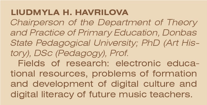 До напрямів досліджень професорки Гаврілової Людмили Гаврилівни додалися теми електронних освітніх ресурсів, проблем формування й розвитку цифрової культури та цифрової грамотності майбутніх учителів музичного мистецтва. Для втілення своїх ідей вона розробила мультимедійний підручник «Історія музичного мистецтва» й електронний навчальний посібник «Українська духовна музика», які успішно застосовує на практиці.
