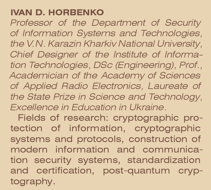 розроблення та впровадження комплексів і засобів криптографічного захисту інформації (КЗІ); упровадження засобів захисту від несанкціонованого доступу (НСД); створення засобів та комплексів технічного захисту інформації (ТЗІ); експертиза й аудит інформаційної безпеки: спеціальні дослідження комплексів технічного захисту інформації; експертиза комплексних систем захисту інформації та аудит інформаційної безпеки. Багато років професор Іван Дмитрович Горбенко досліджує криптографічний захист інформації, криптографічні системи й протоколи, побудову сучасних захищених інформаційно-комунікаційних систем, працює у сфері стандартизації та сертифікації, а також постквантової криптографії. Результати науково-методичних, наукових та практичних досліджень представлено в багатьох працях ученого. За час науково-педагогічної діяльності науковець видав понад 300 публікацій. У його доробку — 18 підручників і монографій, більше ніж 150 статей, 95 патентів на винаходи й 180 доповідей на наукових заходах. Крім того, учений є співавтором 5 монографій, які широко використовують у навчальному процесі в Україні для підготовки за спеціальностями «Кібербезпека» та «Інформаційна безпека». 27 його робіт опубліковано у виданнях Scopus, h-індекс — 7. І.Д. Горбенко очолював розроблення й впровадження до навчального процесу Харківського національного університету імені В.Н. Каразіна, Національного університету «Львівська політехніка» й Харківського національного університету радіоелектроніки, а також силових та державних структур і банківської сфери науково-навчальних комплексів електронного підпису, захисту ІР та ТСР мереж, а також засобів кібербезпеки (серверів та засобів серій «Гряда», «Канал», «Бар’єр», «Кристал» тощо). Під його керівництвом розроблено та введено в дію національні стандарти криптографічного захисту інформації ДСТУ 7624:2014, ДСТУ 7564:2014 та ДСТУ 8845:2019. Їх вивчають у провідних вітчизняних університетах та використовують силові структури. За тривалий час науково-педагогічної діяльності вчений сформував потужну наукову школу, у межах якої під безпосереднім науковим керівництвом і консультуванням Івана Дмитровича захищено 7 докторських та 34 кандидатські дисертації щодо криптографічних методів, систем, комплексів і засобів криптографічного захисту інформації. Він належить до складу спеціалізованої вченої ради Харківського національного університету імені В.Н. Каразіна. У 2012 р. за систему захисту державних інформаційних ресурсів у складі авторського колективу Івану Дмитровичу Горбенку присуджено Державну премію України в галузі науки і техніки. За вагомий внесок у розбудову сфери зв’язку та захисту інформації в Україні відзначений пам’ятними знаками «Почесна відзнака Держспецзв’язку» та «Служба шифрованого зв’язку і режиму секретності Збройних сил України» Міністерства оборони України. Професор І.Д. Горбенко є полковником у відставці. Більшу частину багаторічної військової служби присвятив науково-педагогічній діяльності у ВНЗ із підготовки військових фахівців із захисту інформації.