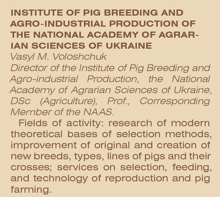 Створені нові породи свиней, зокрема миргородська, полтавська, українська та червона білопояса м’ясні за показниками продуктивності перевищують наявні на 10–15 %. Обґрунтовано принципи з реконструкції свиноферм на 20–100, 300, 600, 1200 свиноматок, які застосовують у малих, середніх і великих господарствах України. Розроблено технології, впроваджені в понад 40 проєктах виготовлення свинини у 8 областях різних регіонів України, а також уведено в широку виробничу практику метод штучного осіменіння свиней. Саме тут вперше у світі ще в 1950 р. одержано поросят-трансплантантів.