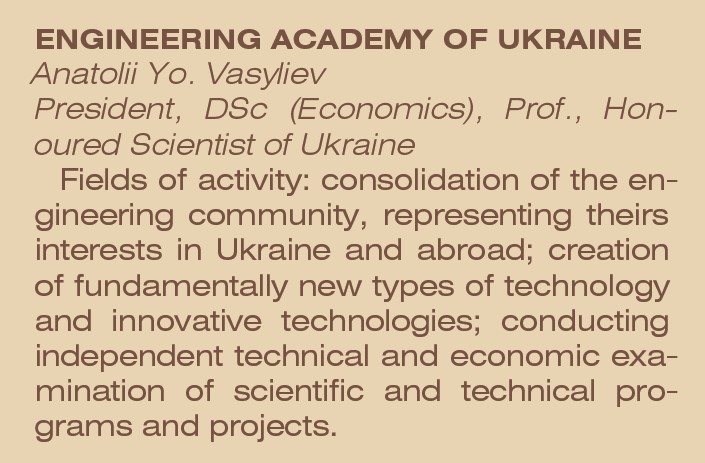 Інженерна академія України консолідує зусилля вчених та фахівців задля нарощування інтелектуального та інноваційного потенціалу у сфері інженерної діяльності. На чолі з президентом Анатолієм Йосиповичем Васильєвим сприяє розвиткові науково-технічної діяльності в Україні й впровадженню досягнень науки у виробництво. Народився 6 квітня 1953 р. Трудову діяльність розпочав після закінчення Харківського політехнічного інституту інженером на Харківському турбінному заводі, працював доцентом, професором Харківського авіаційного інституту й Харківського національного технічного університету сільського господарства імені П. Василенка. З 1991 р. — головний учений секретар, а з 1996 р. — президент Інженерної академії України.