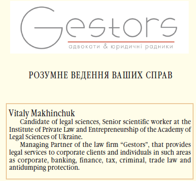 КЕРУЮЧИЙ ПАРТНЕР ЮРИДИЧНОЇ ФІРМИ «GESTORS», КАНДИДАТ ЮРИДИЧНИХ НАУК, СТАРШИЙ науковий СПІВРОБІТНИК НАУКОВО-ДОСЛІДНОГО ІНСТИТУТУ ПРИВАТНОГО ПРАВА і ПІДПРИЄМНИЦТВА НАЦІОНАЛЬНОЇ АКАДЕМІЇ ПРАВОВИХ НАУК УКРАЇНИ
