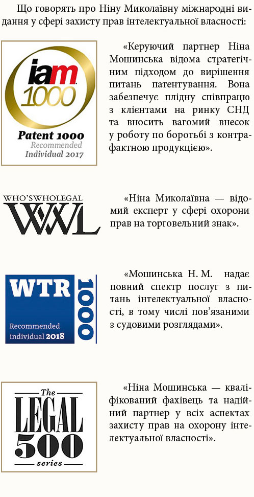 Кваліфікацію та ділові якості Ніни Мошинської визнано не тільки в нашій країні, а й за кордоном. За результатами міжнародного рейтингу «Best Lawyers», Ніна Миколаївна з 2009 р. входить до складу кращих юристів України, які практикують у сфері інтелектуальної власності. З 2014 р. вона визнана кращим експертом в таких категоріях як патентні спори, патентне діловодство та нагороджена почесним званням IP Star. Згідно з рейтингом «WIPR Leaders», Ніна Мошинська є лідером у сфері патентних послуг в Україні. «Global Law Experts», «Corporate INTL» та «Leaders in Law» визнали кращим експертом із захисту прав на інтелектуальну власність.
