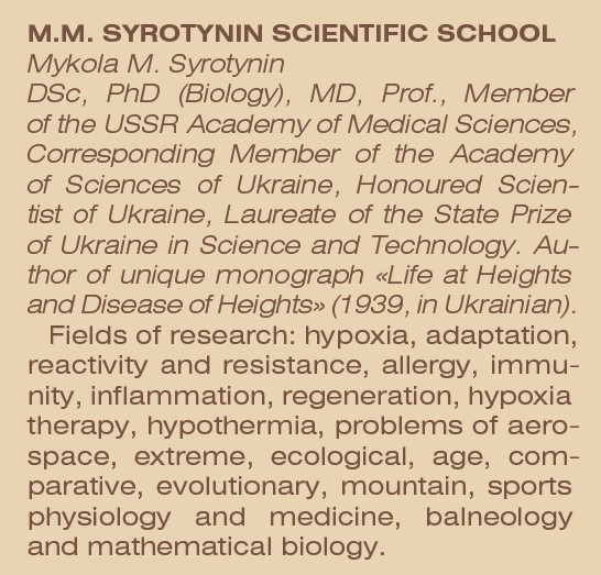 В Києві та на ЕМБС протягом кількох десятиліть концентрувалися наукові сили в галузі адаптації до гіпоксії. Від 1929 р. там загартовувалася й підіймалася до вершин науки видатна патофізіологічна школа М. М. Сиротиніна (це виховані ним 25 докторів, 60 кандидатів, а його учнями — загалом більше ніж двісті докторів і кандидатів наук), розвиваючи нові напрями та наповнюючи витоки нових теорій і винаходів.