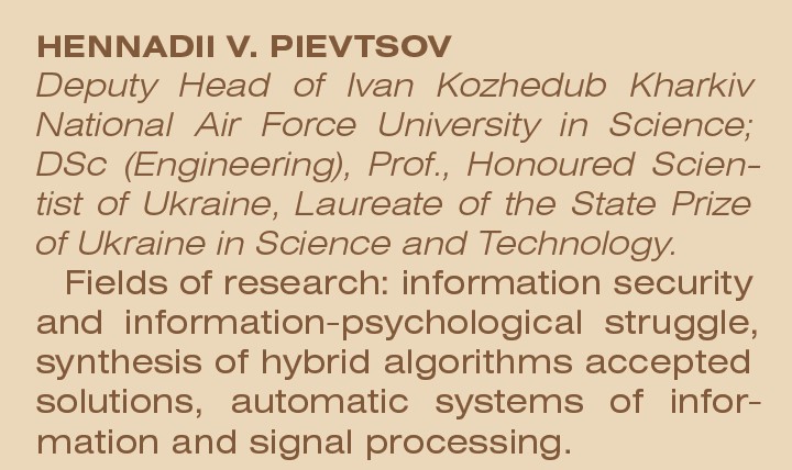 Розробки відомого фахівця в галузі побудови озброєння та військової техніки професора Пєвцова Геннадія Володимировича активно застосовуються Збройними Силами та підприємствами України. Наукова діяльність ученого зосереджена на вирішенні проблем інформаційної безпеки й інформаційно-психологічної боротьби, синтезу гібридних алгоритмів прийнятих рішень та автоматичної системи обробки інформації й сигналів.