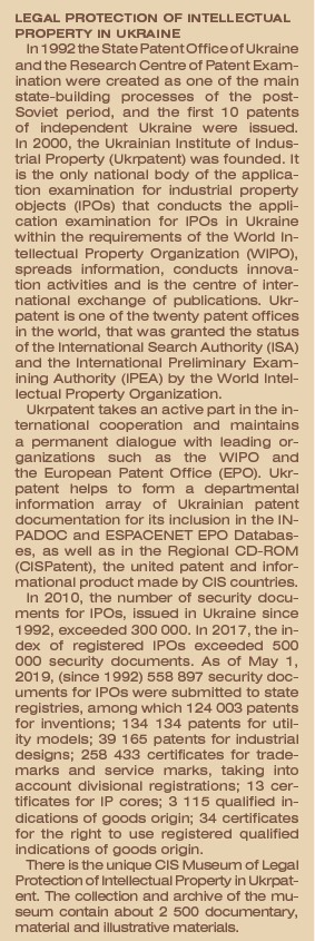 Становлення державної системи охорони інтелектуальної власності (ІВ) в Україні зі здобуттям незалежності відбувалося в декілька етапів. У межах основних державотворчих процесів пострадянського часу вже в 1992 р. створюються Державне патентне відомство України та Науково-дослідний центр патентної експертизи, видаються перші 10 патентів незалежної України. У 1993 р. Верховна Рада України ухвалює основні галузеві закони — «Про охорону прав на винаходи і корисні моделі», «Про охорону прав на промислові зразки» та «Про охорону прав на знаки для товарів і послуг». За шість років на базі Науково-дослідного центру патентної експертизи створюється Державне підприємство «Інститут промислової власності». У 2000 р. на базі Державного патентного відомства України й Державного підприємства «Інститут промислової власності» створюється Державне підприємство «Український інститут промислової власності» (Укрпатент), яке входить до сфери управління Державного департаменту інтелектуальної власності Міністерства освіти і науки України. У 2011 р. Укрпатент передано до сфери управління Державної служби інтелектуальної власності України. У 2017 р. в рамках процесу реформування державної системи правової охорони інтелектуальної власності в Україні Державна служба інтелектуальної власності України (ДСІВ) припинила виконувати функції з реалізації державної політики у сфері ІВ. Відтоді відповідну діяльність здійснює Міністерство економічного розвитку і торгівлі України (МЕРТ).