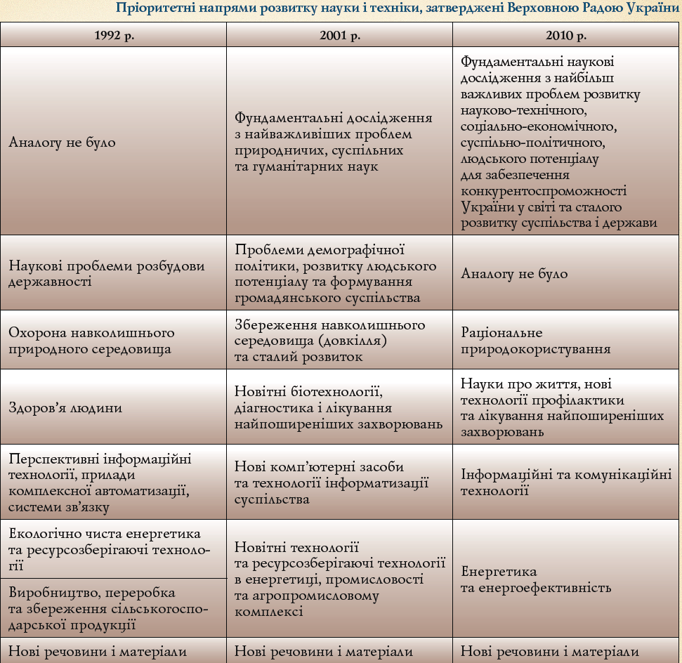 У жовтні 1992 р. відповідною постановою Верховної Ради України були затверджені пріоритетні напрями розвитку науки і техніки в Україні, наступні їх варіанти були прийняті у 2001 та 2010 рр.