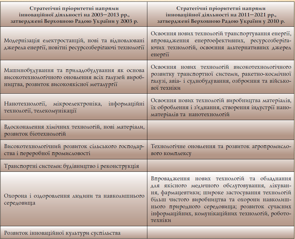У відповідності з вимогами цього закону Верховна Рада України визначила стратегічні пріоритетні напрями інноваційної діяльності в Україні на 2003–2013 рр. При цьому законодавці підтримали пропозицію Центру досліджень науково-технічного потенціалу та історії науки (ЦДПІН) імені Г. М. Доброва НАН України застосувати до їх формування методологію ієрархії пріоритетів, передбачивши для кожного її рівня свій специфічний механізм реалізації. Інноваційні пріоритети були ранжовані на стратегічні (10 років), середньострокові (3–5 років) загальнодержавного рівня, середньострокові галузевого рівня, середньострокові регіонального рівня.