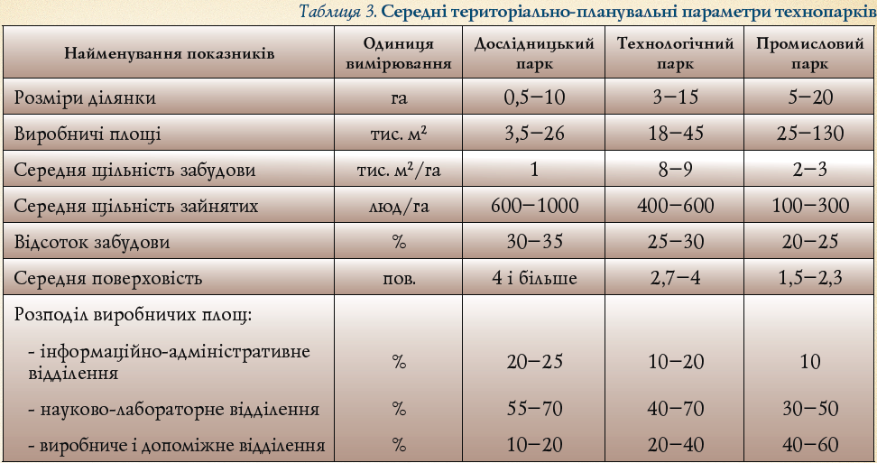 Вже на етапі проектування слід орієнтуватися на деякі середні територіально-планові параметри технопарків (Табл. 3). Наведені показники характеризують лише параметри розміщення інноваційних структур при створенні їх в умовах міста або в умовах окремого населеного пункту іншого типу. Для територіальних інноваційних структур типу агротехнополісу або полісу рекреаційного типу територіально-планові параметри формуються виходячи з інших принципів, які в цьому випадку не беруться до уваги.