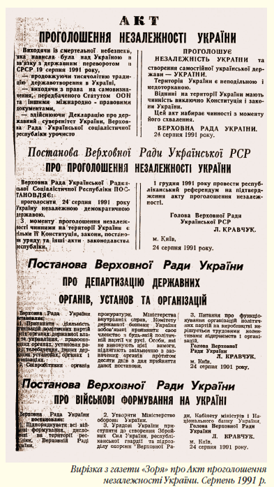 Виражаючи волю народу, Верховна Рада республіки 24 серпня 1991 p., прийняла «Акт проголошення незалежності України». В ньому, зокрема, вказано: «... — продовжуючи тисячолітню традицію державотворення в Україні, — виходячи з права на самовизначення, передбаченого Статутом ООН та іншими міжнародними документами, — реалізуючи “Декларацію про державний суверенітет України”, Верховна Рада проголосила незалежність України та створення самостійної української держави — Україна, територія є неподільною і недоторканою. Віднині. — заключав Акт, — на території України мають чинність виключно Конституція і закони України».