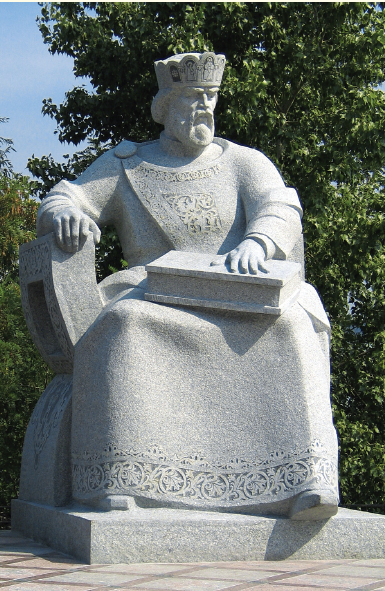 Адже недаремно біля центрального входу, немов на варті, височіє велична постать Святослава Хороброго — переможця Хазарії. Дев’ятиметрова гранітна постать легендарного Великого Князя Київської Русі спирається на меч — символ могутності та непереможності. Пам’ятник Святославу, до речі, поки що єдиний у Києві, з’явився у вересні 2003 р.