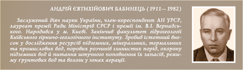 У 1961 р. на чолі з Андрієм Євтихієвичем Бабинцем на базі Інституту геологічних наук АН УРСР було створено сектор гідрогеології та інженерної геології, який став багатопрофільним центром академічної науки. Тут були широко розвинені традиційні та виникли нові напрямки гідрогеологічних та інженерно-геологічних досліджень.