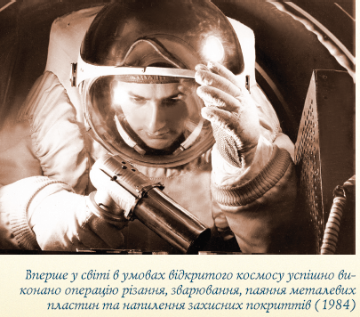 У 1969 р. на космічному кораблі виконано перші у світі експерименти зі зварювання у космосі. У подальшому розроблено конструкції антен, досліджено у невагомості металургійні процеси тощо. У 1984 р. уперше у відкритому космосі зварювали, паяли, різали і напилювали електронно-променевим інструментом.