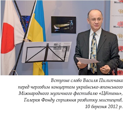 «Гігієна для валторністів» (2003); твори В. Г. Пилипчака також записані у Фонд українського радіо. За час плідної мистецької діяльності Василь Пилипчак нагороджений низкою відзнак: грамотою Міністерства закордонних справ Японії за багаторічну співпрацю у розвитку українсько-японських зв’язків у галузі культури (2017), медаллю Міжнародної академії рейтингових технологій і соціології «Золота Фортуна» на честь 150-ї річниці Національного академічного театру опери та балету України імені Т. Г. Шевченка (2017). Для митця першочерговою є справа збереження історичної пам’яті, вшанування та увічнення імен видатних діячів культури, чому присвячена його громадська й спонсорська діяльність. У 2008 р. організував проведення І конкурсу валторністів ім. В. М. Бабенка. У 2014 р. відшукав хату, де народився відомий поет Володимир Свідзинський (с. Маянів Тиврівського району Вінницької області), викупив її у власників і передав на утримання місцевій багатодітній сім’ї. Також композитор власним коштом установив на обійсті пам’ятник Володимиру Свідзинському (2014). На вірші поета Василь Пилипчак написав симфонію та цикл «Музичних новел». У 2016 р. разом з американським поетом, письменником, драматургом, волонтером Волтером Орр Скоттом, що живе в м. Жмеринка, організували в м. Тиврів Вінницької області Перший юнацький відкритий літературний конкурс імені Володимира Свідзинського. Василь Пилипчак та японський флейтист і диригент Уено Такасі є засновниками українсько-японського Міжнародного музичного фестивалю «Цвітень». Саме завдяки їхній міцній дружбі, українці можуть насолоджуватися музикою та майстерністю японських митців, обмінюватися досвідом. У рамках XXII міжнародного фестивалю «Київ Музик Фест» у 2011 р. була проведена акція «Україна — Японія: “Молитва цикад”», приурочена трагічним подіям, що сталися на АЕС у Фукусімі та Чорнобилі. Автором ідеї був Уено Такасі. Після японської трагедії в нього виникла думка написати «Молитву», присвячену цим двом жахливим подіям, яку він запропонував втілити у життя Василю Пилипчаку. Для українського митця це виявилося вирішальною подією в творчості. Після довгих творчих пошуків він написав білий вірш, який і став ключем до камерної симфонії під назвою «Семі но оінорі — молитва цикад». Вперше симфонія була виконана 29 вересня 2011 р. Президентським оркестром Збройних сил України під орудою Уено Такасі. Як спонсор Василь Григорович спільно з видавництвом «Discursus» взяв участь у виданні поетичної збірки Наталі Ткачик «Наскрізь» (2014) та збірника статей про творчість Володимира Свідзинського «Незаймані слова» (2018). У сімейному житті Василь Пилипчак також чудово реалізувався: має двох доньок — Олесю та Іванну, сина — Юлія, онуків — Ярославу, Лізу, Марію-Літицію, Ігоря, Богдана, Матія, правнучку — Поліну. Творчість натури та глибоке відчуття музики проявилися сповна й у нащадків. Син Юлій, як і батько, працює у симфонічному оркестрі Національної опери України солістом-концертмейстером (з 2016 р.); донька Іванна — флейтистка, працює в симфонічному оркестрі Мюнхенського радіо; онука Ярослава — концертуюча солістка-арфістка. У найближчих планах Василя Пилипчака — проведення у Львові світової прем’єри своєї камерної симфонії № 3 «Сповідь про молитву». Святкування сторіччя з дня народження Валентина Миколайовича Бабенк